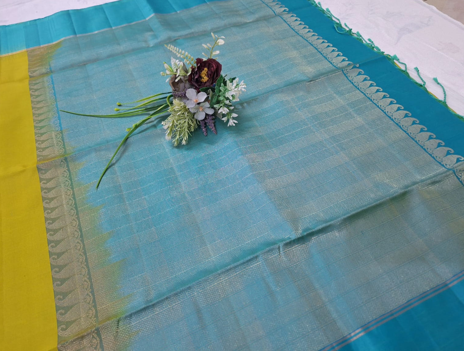 Pure Handloom Soft Silk - Parrot Green & Ocean Blue Gandaberundu motifs