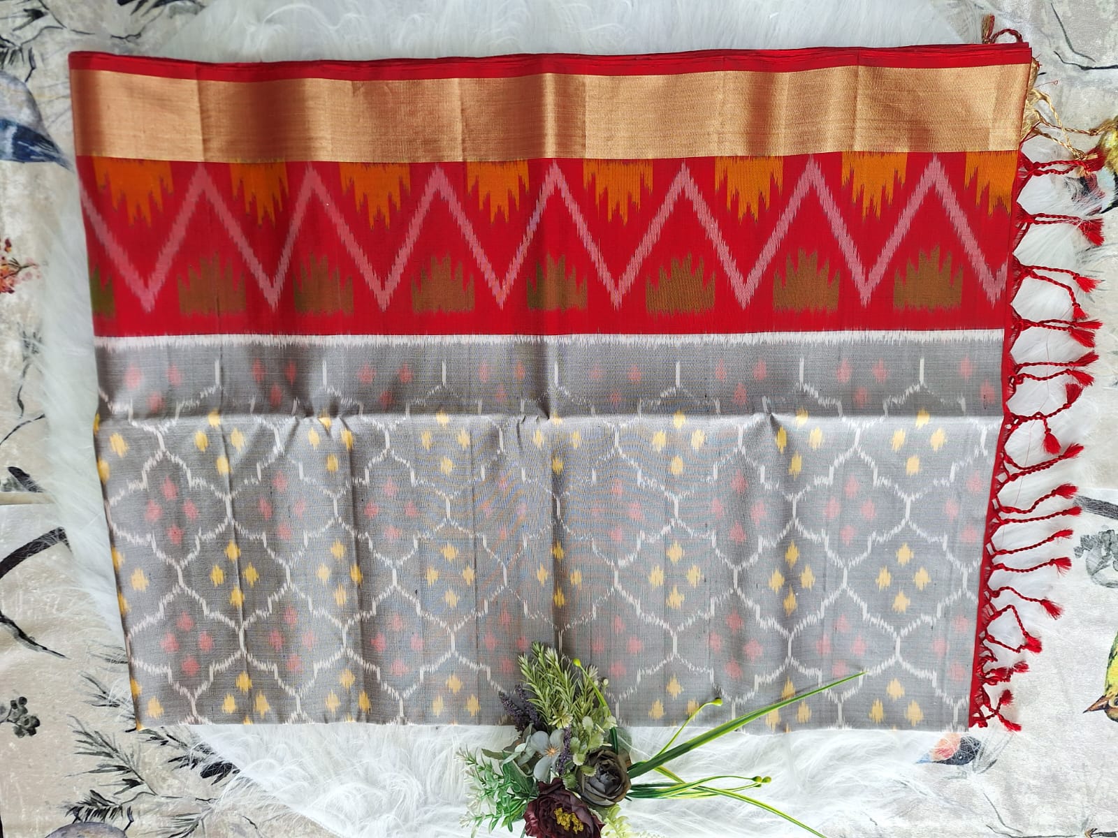 DESCRIPTION - Radiate regal charm in this rich grey & red Ikat saree combination adorned with delicate floral weaves and bold gold zari. Golden borders and tassels complete the drape with a touch of festive brilliance, a complete elegant piece. Complete handwoven saree. Ideal for all sorts of wedding celebrations, poojas, parties, formal & informal gatherings and traditional events.