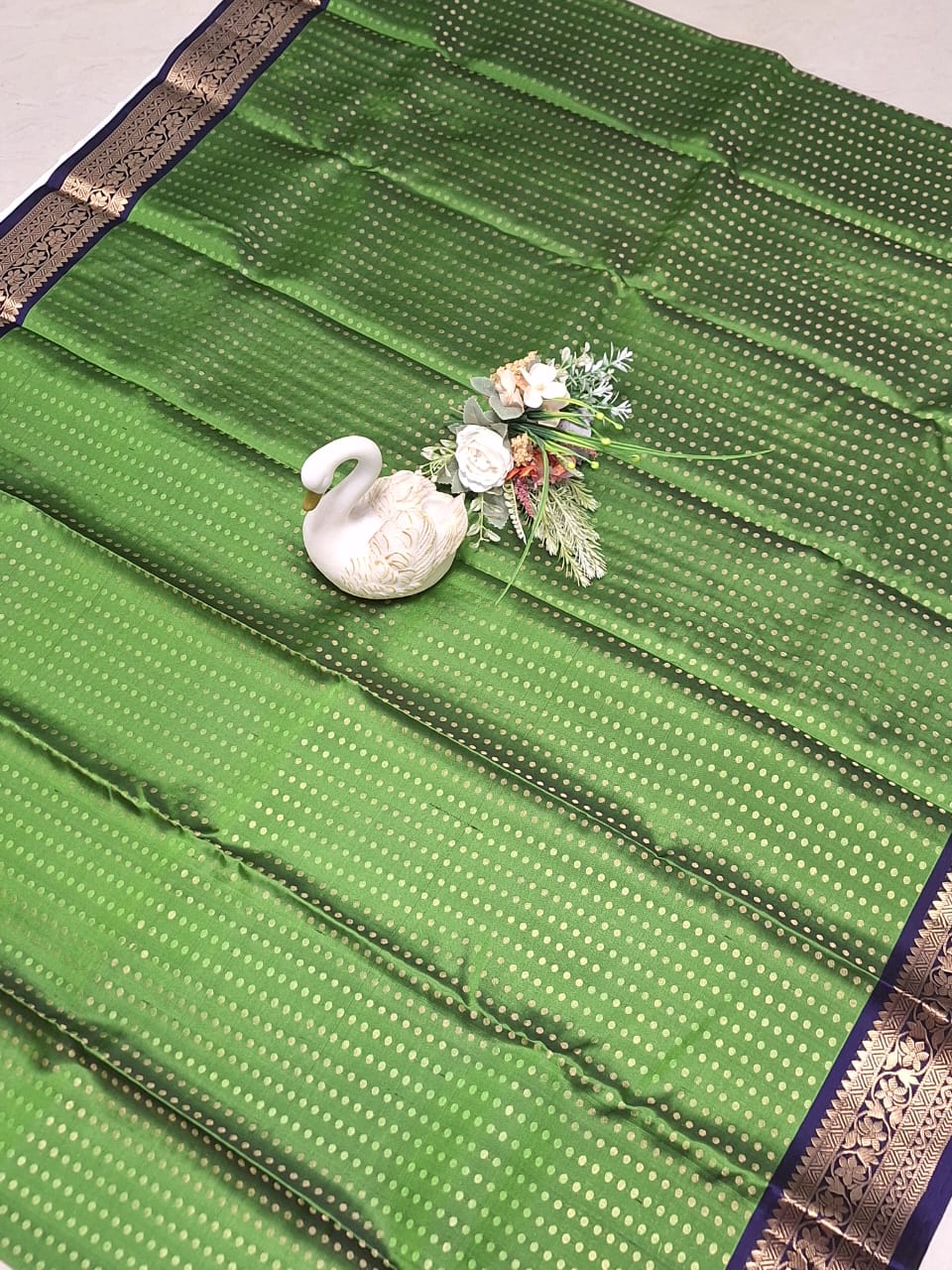 Pure Handloom Soft Silk - Lawn Green-Navy Blue 1000 boota with Kanchi border