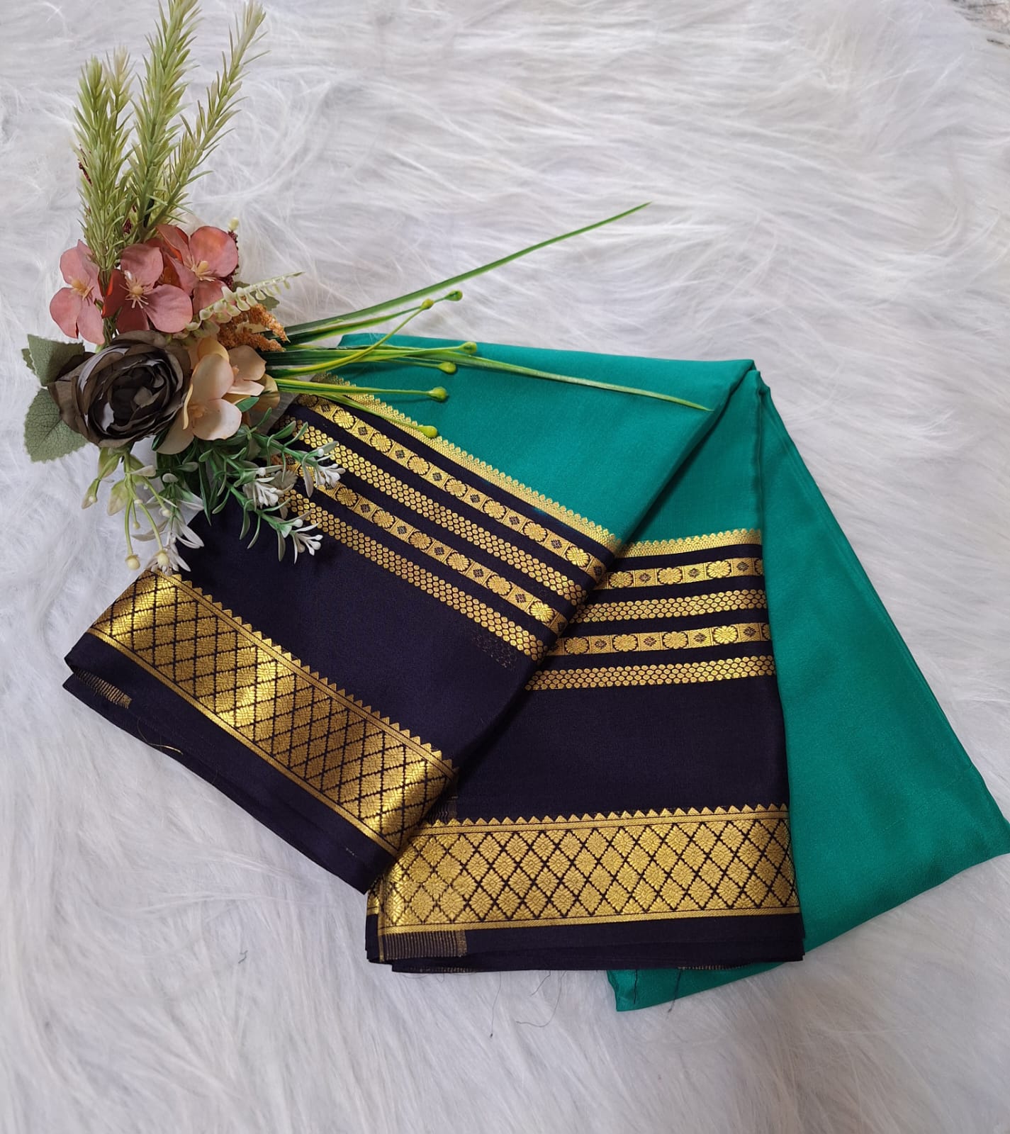 Pure Mysore Crepe Silk - Pine Green & Navy Blue Embellished border