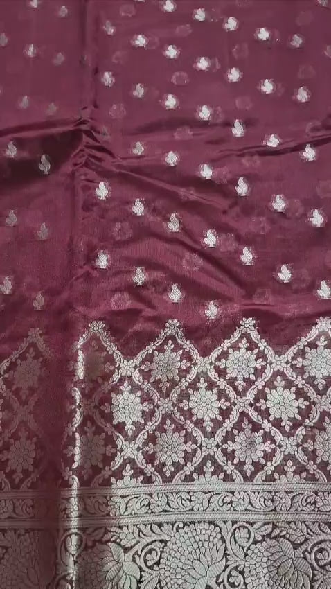- Design: The body of the saree features delicate, evenly spaced gold zari bootas (small floral motifs) woven throughout, giving it a rich yet graceful look. The lower border is intricately woven with gold Zari work in a floral diamond shaped jaal (net) pattern, typical of Banarasi craftsmanship. The exuberantly rich pallu with thickly carved floral design all over depicts fine craftsmanship. Comes with dotted blouse in brocade style and rich handmade tassels on the pallu.