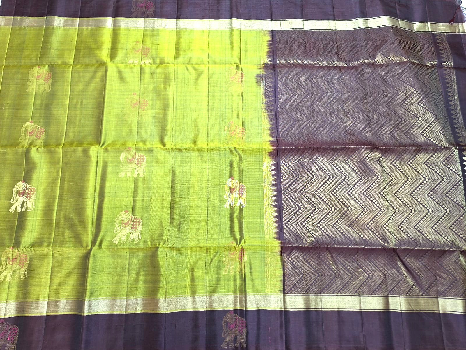 Adorned with golden elephant motifs, each step feels like a majestic parade of Elephants. A saree that speaks volumes through its colors, craftsmanship, and culture. For the woman who carries heritage with pride and power. Ideal for festive occasions, and traditional ceremonies or grand celebrations!!