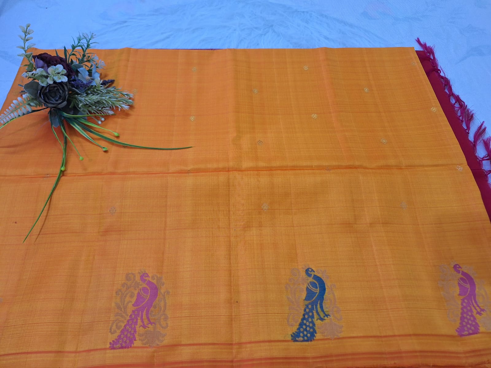 DESCRIPTION - Radiate festive charm in this vibrant fusion of turmeric yellow and rose pink silk. Soft tassels and a bold border elevate its elegance! The contrast and craftsmanship of peacocks spread all across the border on both side and small diamond butas evoke tradition wrapped in bold celebration. A perfect drape for weddings and cultural soirees — where heritage meets brilliance. Suitable for light occasions, temple visits, celebrations and pooja/haldi ceremonies.