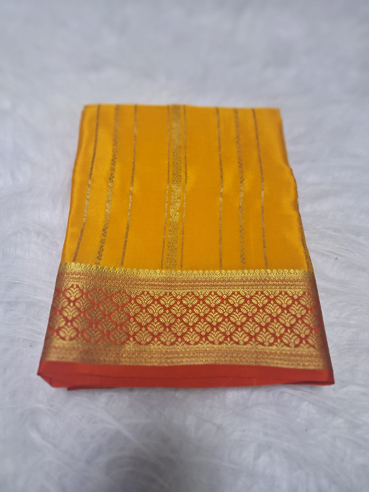DESCRIPTION - This Mysore crepe silk silk saree features a vibrant mustard yellow body adorned with gold zari vertical stripes. The richly woven red and gold zari border adds a regal charm, while the rust-orange selvedge enhances the traditional appeal. Perfect for festive and heavy ceremonial occasions, gatherings, graha pravesham, poojas ceremony or any kind of celebrations. A masterpiece that will surely make head turns on you.