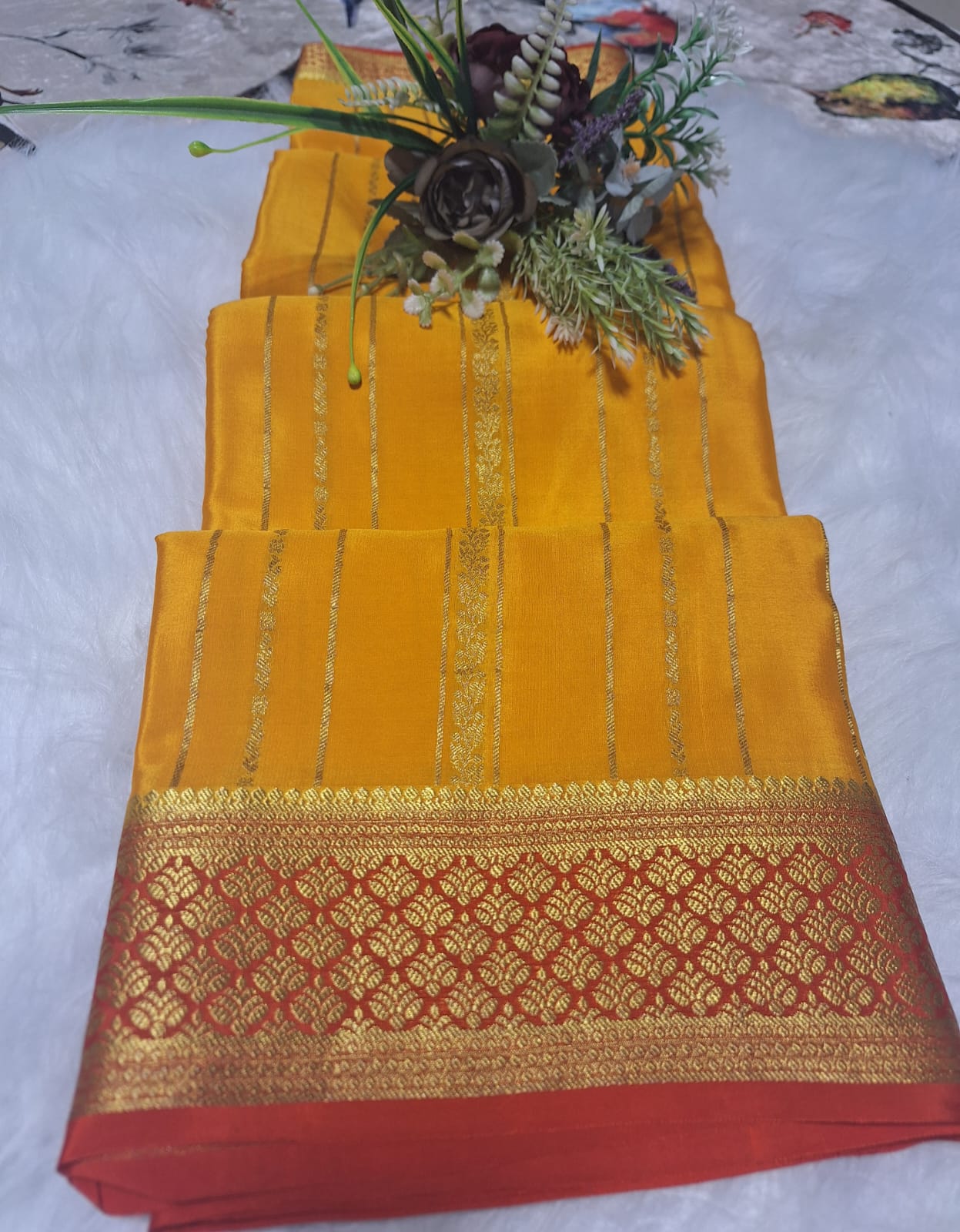 Pure Mysore Crepe Silk - Mustard & Red Golden vertical zari lines